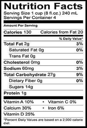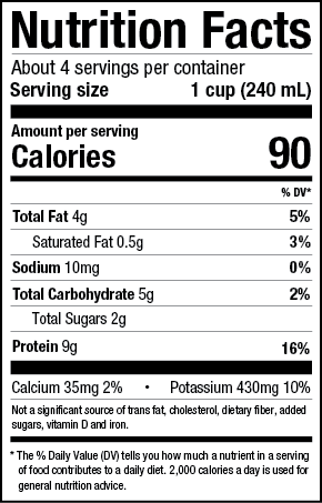 One cup (240 ml) contains 70 calories, 1 gram of fat, 2 grams of protein and 12 grams of carbohydrates (56).